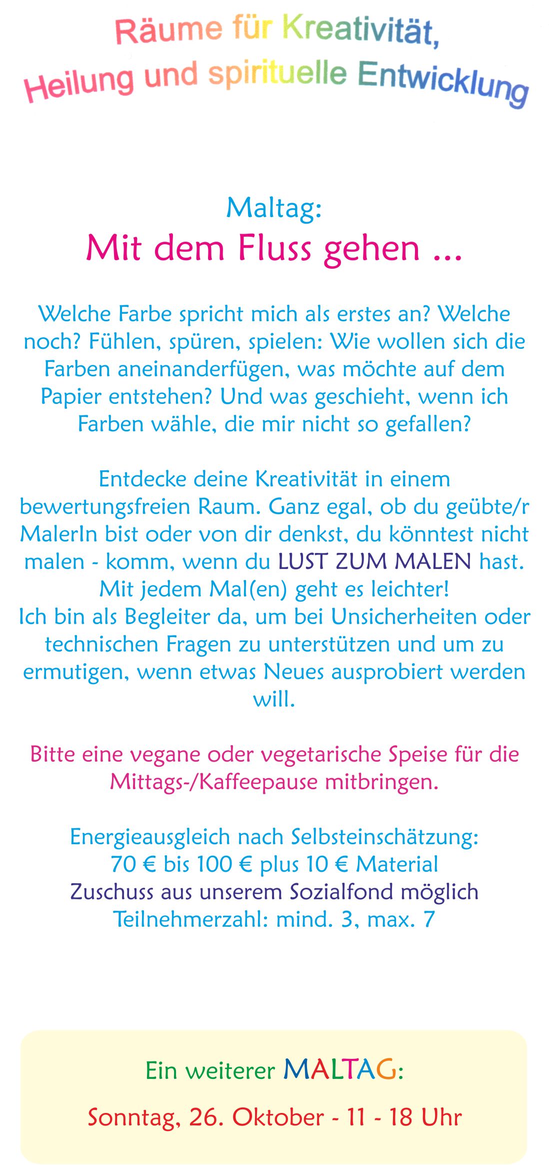 Es können beim Malen Gefühle wie Frust, Wut, Angst, Trauer oder Liebe und Zärtlichkeit hochkommen – oder es entsteht eine Geschichte – oder es ist einfach die Freude an den Farben und am Gestalten - alles darf sein! Das Ergebnis ist genauso ungewiss, wie die dafür benötigte Zeit. Durch die Erfahrungen und Erlebnisse auf dem Weg zum „fertigen“ Bild nutzt Du die Chance, einen neuen Weg zu gehen, neue Erkenntnisse zu erhalten, etwas zu transformieren, Dich neu zu erfahren und Deinen Einklang mit Deiner inneren Führung zu verstärken. Wir malen auf großen Papierbogen mit leuchtenden Gouachefarben (jetzt 42 Farbtöne!) in einem gemütlichen Atelier.
