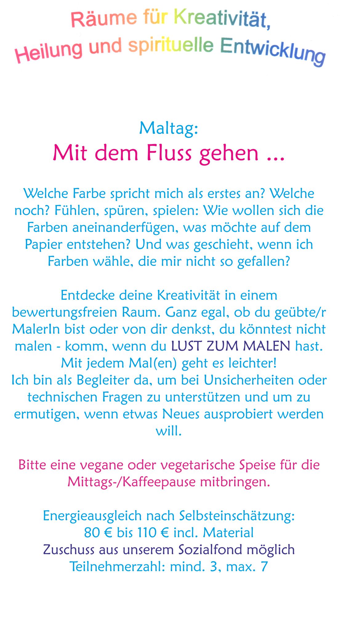 Welche Farbe spricht mich als erstes an? Welche noch? Fühlen, spüren, spielen: Wie wollen sich die Farben aneinanderfügen, was möchte auf dem Papier entstehen? Und was geschieht, wenn ich Farben wähle, die mir nicht so gefallen? Entdecke deine Kreativität in einem bewertungsfreien Raum. Ganz egal, ob du geübte/r MalerIn bist oder von dir denkst, du könntest nicht malen - komm, wenn du LUST ZUM MALEN hast. Mit jedem Mal geht es leichter!