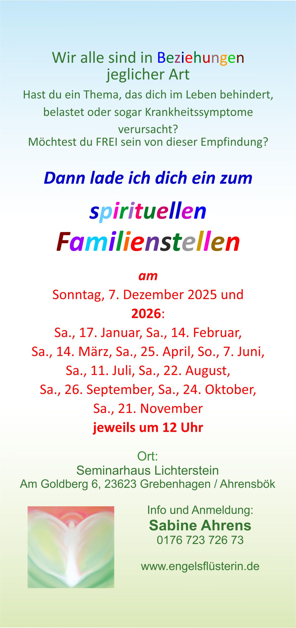 Info und Anmeldung: Sabine Ahrens 0176 723 726 73 www.engelsflüsterin.de